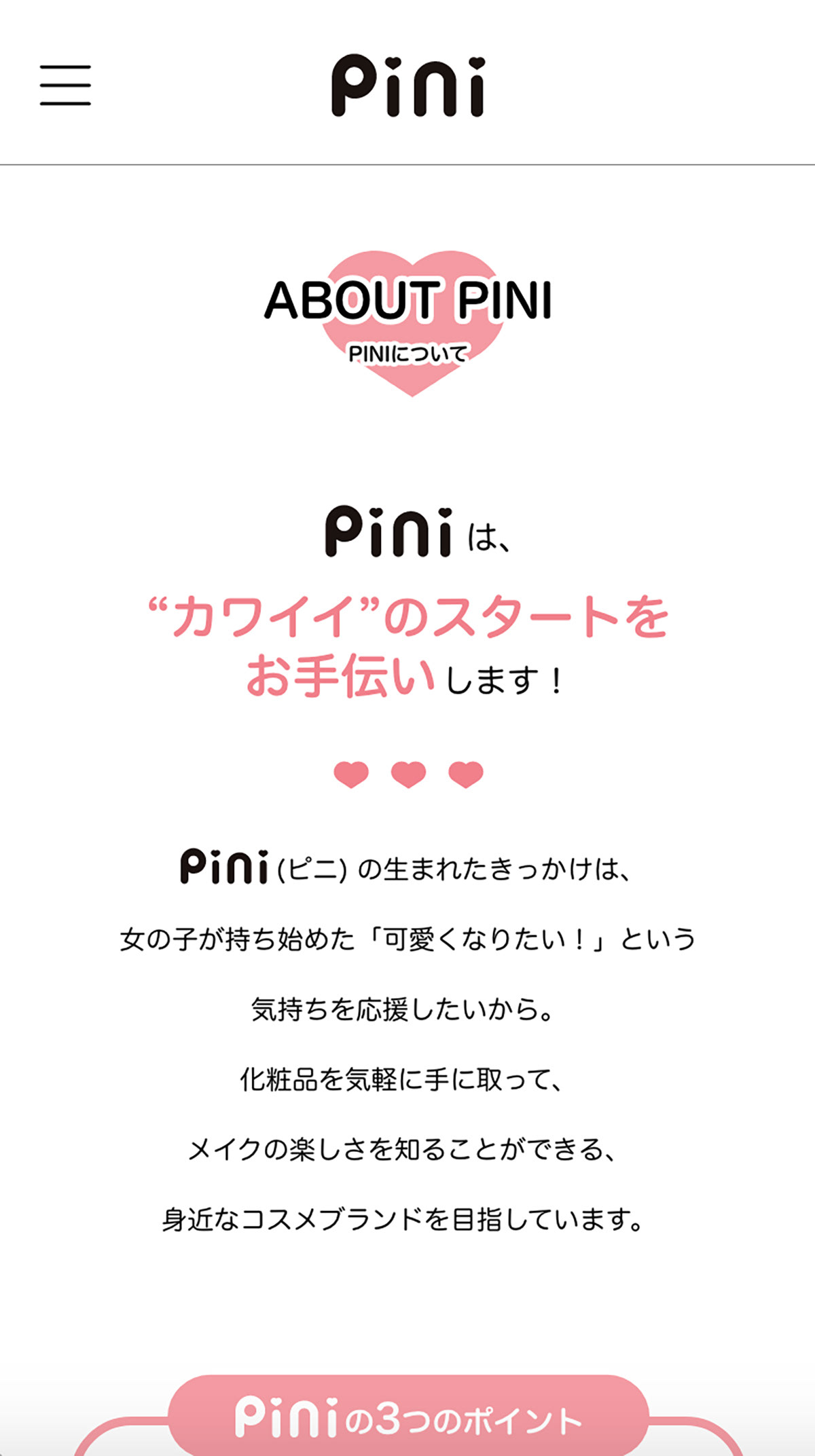 コンセプトは「”カワイイ”のスタートをお手伝い」。これからメイクを始める女の子を応援するために、低価格・ミニサイズ・セット販売の3つの特徴をもつコスメブランドのブランディングをしました。 少し背伸びをしたい年頃の女の子へ向けて、シンプルで大人っぽいパッケージに…だけどロゴを大きめに入れることで可愛さ・若さをちょっぴりプラス。初心者でも気軽に手に取れる、身近なコスメブランドを目指しました。