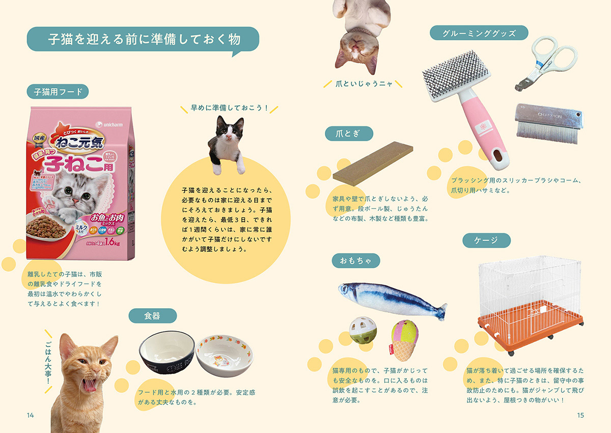 猫を飼いたいけど、猫のことを知らない人に向けた、ガイドブックを制作しました。初心者でも内容が入ってきやすいように、ポップなテイストとわかりやすいイラスト・写真でまとめました。猫の愛らしさ、飼うことの大変さ、それでも飼いたい理由などが、読んだ人に伝わると嬉しいです。